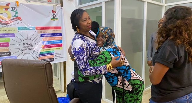 Photos released by the NiDCOM chair show a tearful reunion as Adeola embraced Dabiri-Erewa upon her return, alongside actress Biola Adebayo and actor Adeniyi Johnson, who have supported the family’s public search for Adeola.