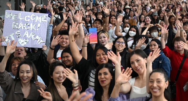 Fans have also been gathering in Seoul outside the group’s agency HYBE’s headquarters, which has been wrapped with the slogan “WE ARE BACK”.