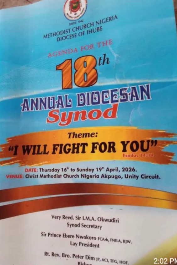 The 18th Synod of the Methodist Church Nigeria, Ihube Diocese with the theme: “I will fight for you (Exodus 14:14), has rolled to a close at the Christ Methodist Church, Akpugo (Unity Circuit ) with the church lamenting over the state of affairs in the country and challenging Christians to rise in prayers.